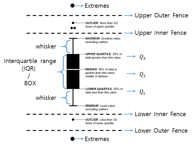 โ ์ต์๊ฐ : ์ 1์ฌ๋ถ์์ - (1.5 * IQR๊ฐ) = ์ต์๊ฐ - Outlier(์ด์์น), Extreme(๊ทน๋จ์น)