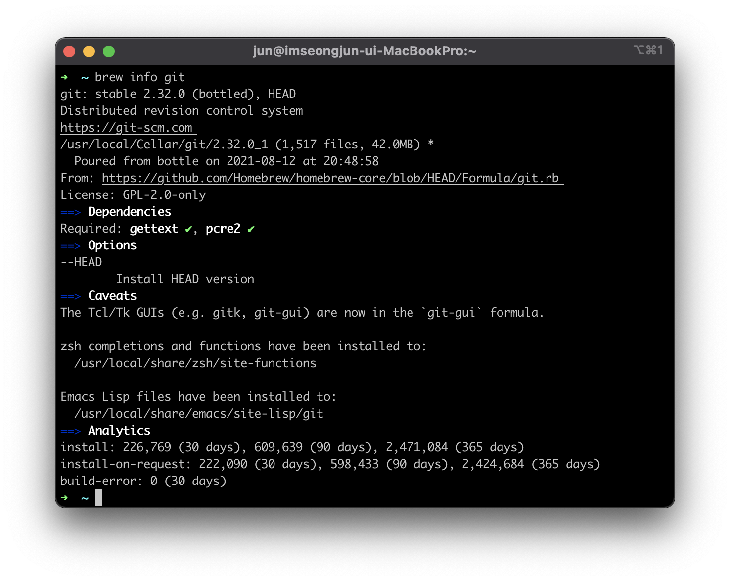 OSX์ ๊ธฐ๋ณธ์ ์ผ๋ก ์ค์น๋์ด์๋ git ์์ง๋ง ํจํค์ง ๊ด๋ฆฌ๋ฅผ ์ํด์ Homebrew์์ ์ฌ์ค์นํ ๊น ํ๋ค.